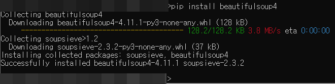 이상으로 python에서 bs4 라이브러리를 설치했다.