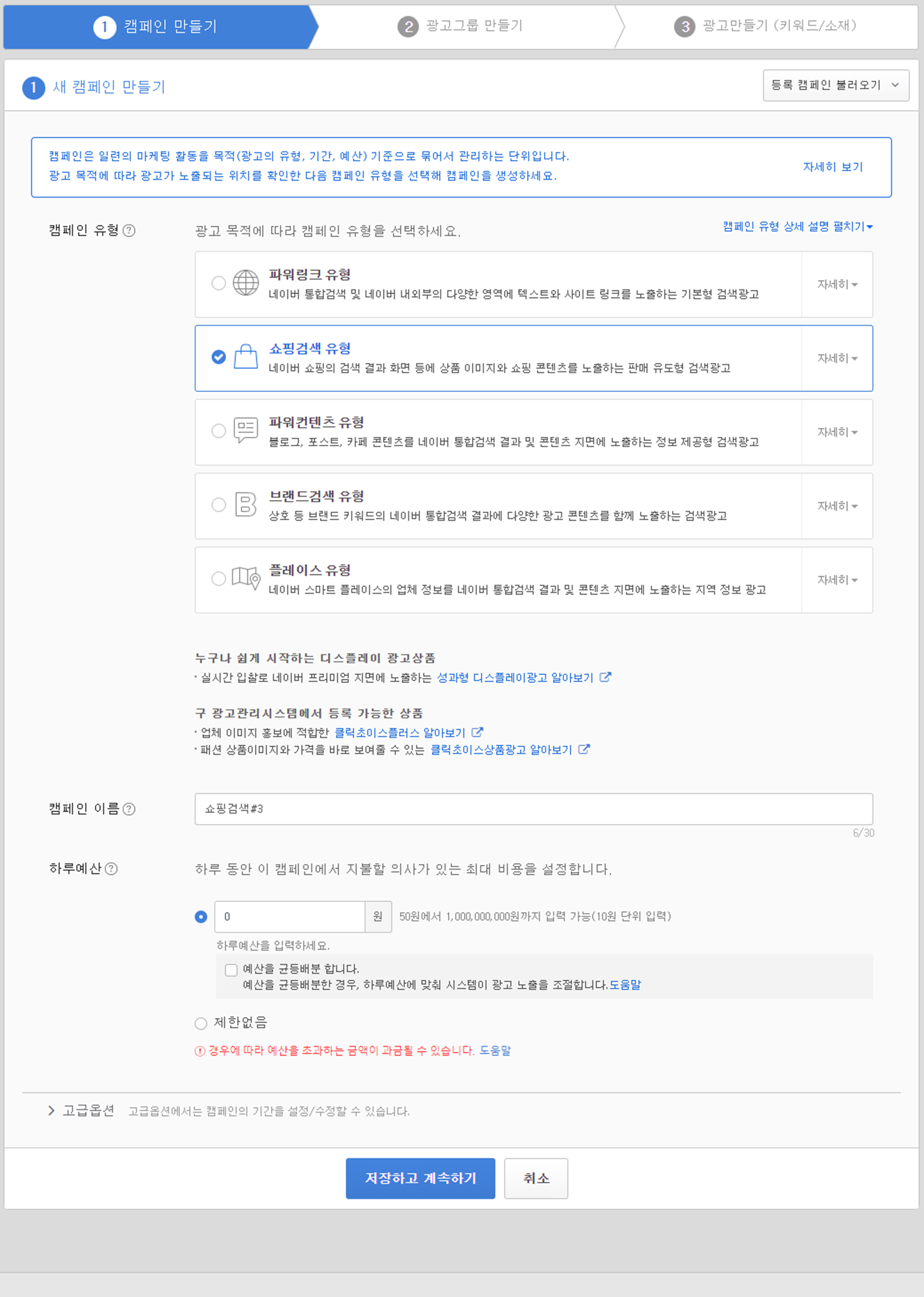 이 캠페인에서 허용 가능한 하루 예산을 설정한다. (이후 단계에도 예산이 나오는데 아마도 여기서는 전체 총 예산, 이후 단계에서는 각 그룹 별 예산을 설정하는 듯 하다)