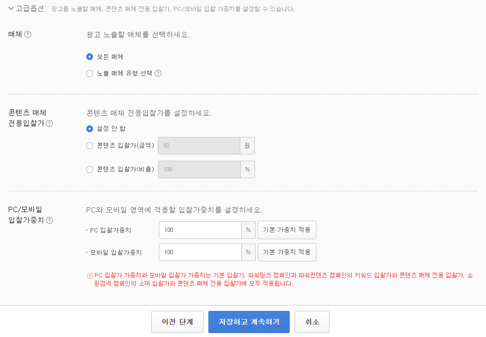 그리고, 광고 클릭당 최대 비용을 설정한다. 이 비용은 이후 단계(소재)에서 입력할 수 있는데, 최종 금액은 그룹에서 설정한 금액보다 소재 에서 설정한 금액이 우선하게 된다. 예를 들어, 그룹에서 50원으로 설정하고 소재에서 500으로 설정하면 CPC는 500원이 된다.